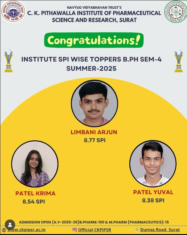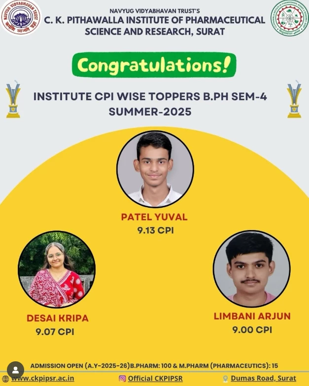 1st Rank: Gupta Sonam - SPI: 8.91 2nd Rank: Bohra Bhumika - SPI: 8.73 3rd Rank: Bardoliwala Pratham - SPI: 8.73 -